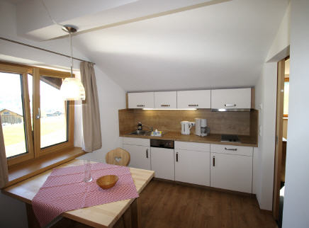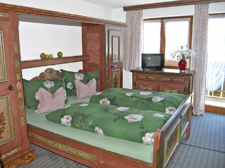 Wohnung für 2 Personen, ca. 30 qm, Wohnschlafraum mit Doppelbett, Wohnessecke, Küchenzeile, Du / WC, Sat-TV, Durchwahltelefon, alpenländisch eingerichtet, Westbalkon mit Panoramablick.