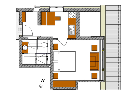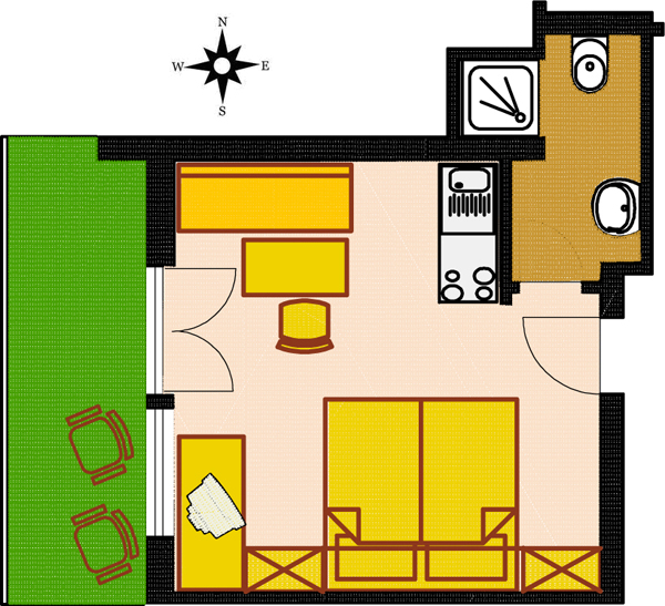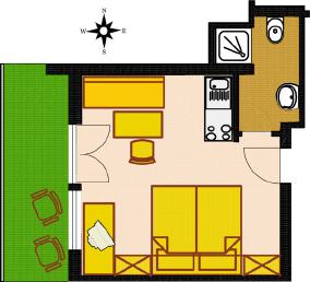 Großzügige Wohnung für 2 Erwachsene und ein Kind, ca. 32 qm, Wohnschlafraum mit Doppelbett und Ausziehcouch, separate Wohnküche mit Essecke und Küchenzeile, modernes Bad mit Du / WC, Sat-TV, Durchwahltelefon.