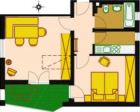 Wohnung für 2 - 4 Personen, ca. 40 qm, Ausziehcouch, Wohnessecke, Küchenzeile, Du / WC, Schlafzimmer mit 2 Betten, Sat-TV, Durchwahltelefon, alpenländisch eingerichtet, Nordbalkon, Westbalkon mit Panoramablick.