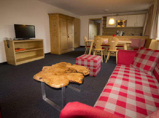 Wohnung für 2 - 6 Personen (max. 4 Erwachsene und 2 Kinder), ca. 77 qm, Wohnraum mit Küchenzeile inkl. Mikrowelle und Spülmaschine, Essecke, ausziehbare Komfort-Schlafcouch, 2 getrennte Schlafzimmer, Badezimmer mit Du / WC, zusäzliches separates WC, Sat-TV, Durchwahltelefon, ca. 10 qm Süd-Balkon mit Panoramablick.